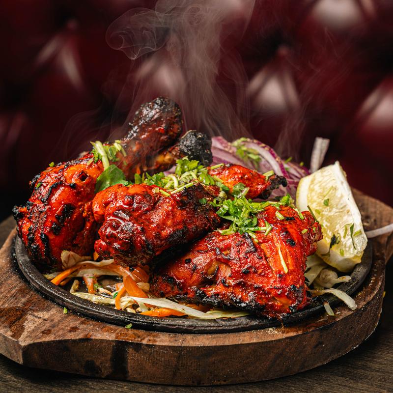 Rich Mughlai-style chicken leg kababs marinated in aromatic spices, cooked in the tandoor (20 minutes cooking time).